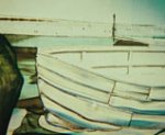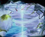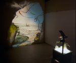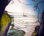 Cave Painting was made for the Jerwood Glass Prize, 2003. A miniature glass model is placed on an overhead projector with light passing through the objects to create a life-size projected image of the scene on the wall. This series of works are inspired by memories of the south coast and are amalgamations of several places. There is a discrepancy between what the viewer sees in the model and the image. The glass objects are washed up, the boat is wrecked, yet in the projected image these things are all in tact, it maybe a view of the same place at a different time. There are no people in the image to enable the viewer to feel that they can occupy it. If the audience cross the projector then their shadow becomes part of the scene.