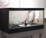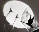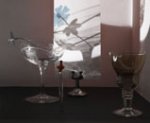 Grey Gardens, 2012, references a domestic display cabinet housing etched drinking glasses. A light from above illuminates a central mirror, propped at an angle. This rotates around the box, casting a circle of reflected light through the glass objects to create animated shadows on the walls of the cabinet. The shadows have the qualities of a pencil drawing. This work is one of a series of investigations into animating still objects though moving the light source.